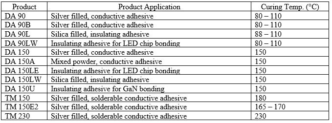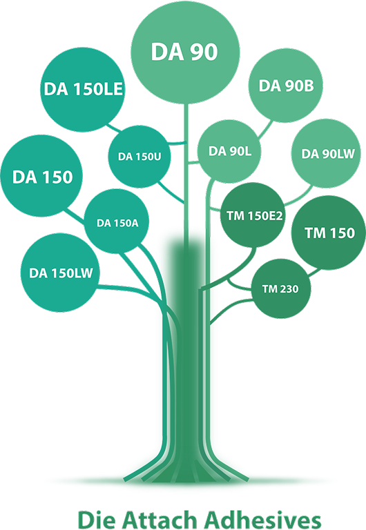 The YINCAE DA 90 series features solvent-free low temperature conductive or insulating die attach adhesives. This series offers excellent adhesion to both the substrate and bare die, can be used for small and large die attachments, and can be used via dispense or printing. This material helps minimize induced stresses, provides outstanding reliability performance, and offers excellent mechanical resistance. The YINCAE DA 150 series features solvent-free high temperature conductive or insulating die attach adhesives. This series offers excellent adhesion to both the substrate and bare die, can be used for small and large die attachments, and can be used via dispense or printing. This material helps minimize induced stresses, provides outstanding reliability performance, and offers excellent mechanical resistance. The YINCAE TM series features solderable conductive adhesives which are fast curing, self-filling, self-leveling, and self-soldering. They can be used as die attach adhesive for a variety of applications including LED, CSP, QFP, etc., and replace conductive adhesives (Ag) or other solder materials such as solder paste or preform. These materials can eliminate outgassing, die skewing and shifting, and solder bleeding. TM series products contain a polymer which encapsulates the soldered interface and provides protection from harsh environmental conditions. Product Application Notes