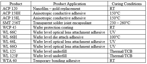 YINCAE's ACP 120 series is an excellent option for customers looking for an anti- oxidation coating for solderable and metal surfaces such as zinc, nickel, steel, aluminum, and more. Features include excellent anti-oxidation performance and adhesion, excellent anti-corrosion and anti-rusting, high thermal resistance, room temperature drying, and easy rework when wet. Some highlights are: • Eliminates Gold Plating Process • Low Cost Ownership • Environmentally Friendly • High Throughput • Reworkable Process • Large Process Window ACP 120 can be customized to meet customer requirements. Our WL 66 series are UV curable optical lid attachment adhesives designed for wafer level lens and optical lens attachment. They provide a bubble free optical coverage, high moisture resistance, and high temperature resistance. The product also remains transparent and does not 'yellow'. Product Application Notes